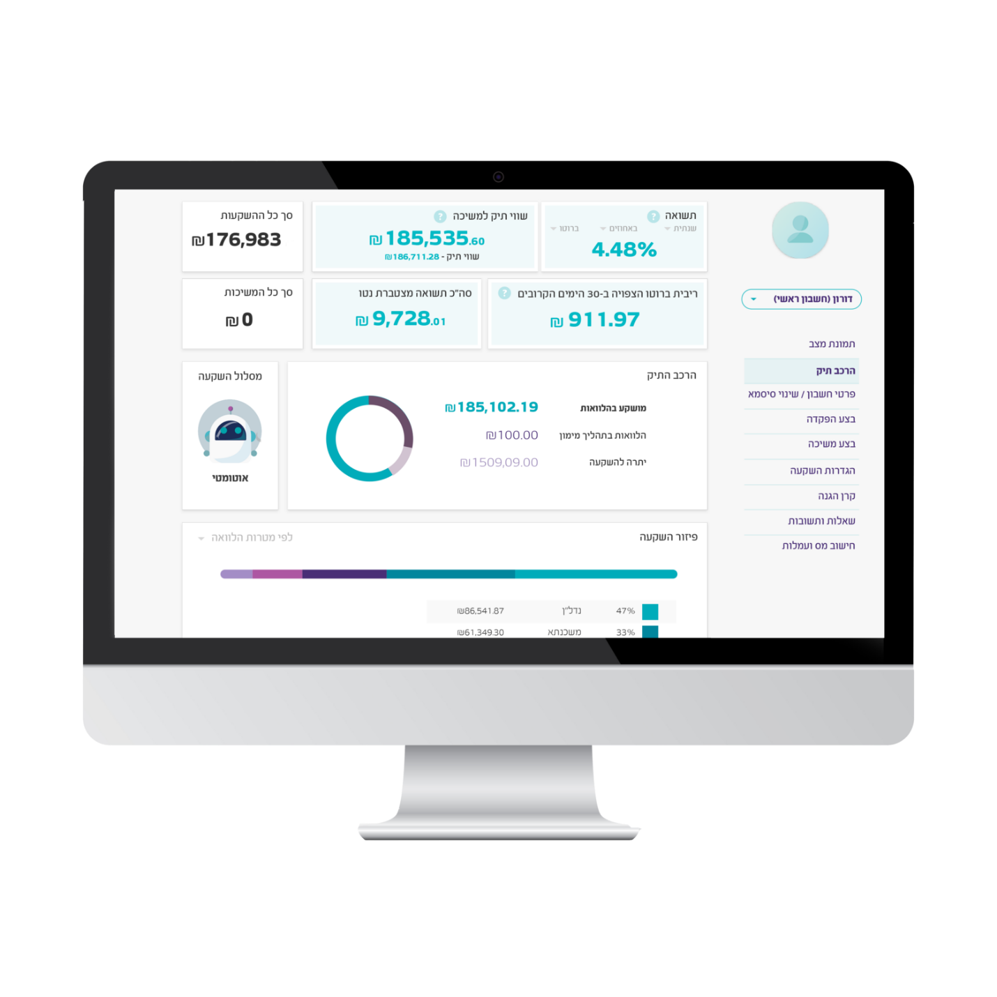 באמצעות האזור האישי שלך ניתן לעקוב בכל שעה ובאופן פשוט אחר הרכב תיק ההשקעות שלך, התשואה, לבצע פעולות און ליין ועוד.